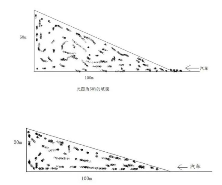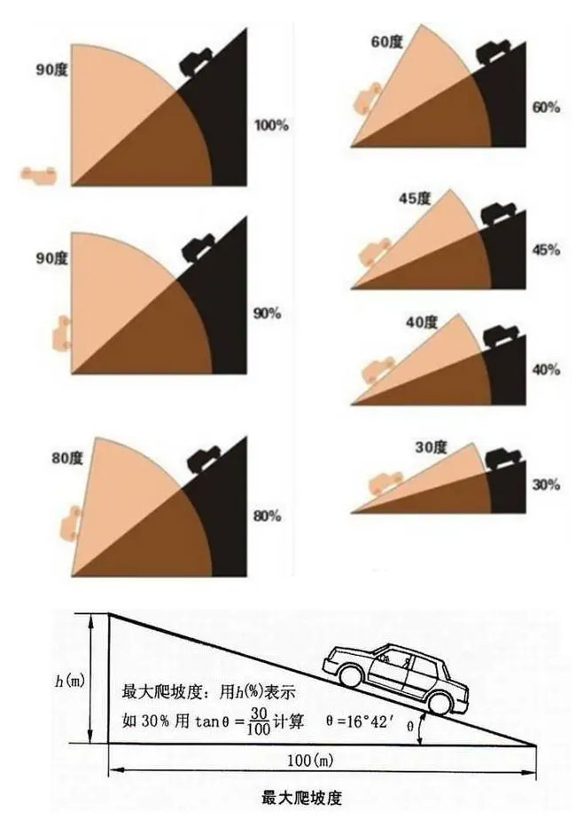观光车的技术参数中都有一项,爬坡度,标为坡度百分比,而不是角度,坡度怎么形成的、坡度与角度的换算:看下图↓介绍。大多数客户对坡度的理解都存在误区,容易与角度混淆。坡度30%相当于角度16.7度。车辆爬坡性能不用“度”表示,是用百分比表示的。